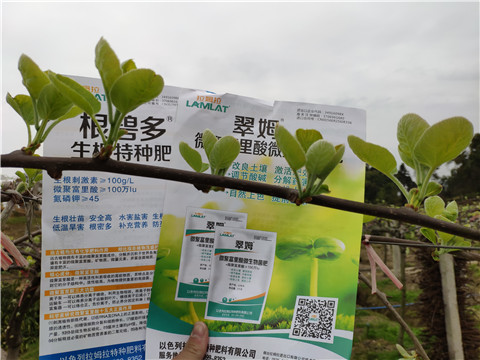 ? ? ? 拉姆拉使用方案:全年使用三次翠姆根碧多5kg+翠姆微生物菌劑5kg/畝。獼猴桃的三次花芽分化是3月,6月,9月份。3月份使用拉姆拉套餐肥,萌芽整齊,預防早期落葉,黃化等問題。六月份是獼猴桃的第二次花芽分化高峰期,同時這階段溫度是高溫天氣,高溫天氣會抑制根系生長,使用拉姆拉套餐肥打破高溫引起的根系生長障礙,讓獼猴桃第二次花芽分化正常進行。采收完果子之后,由于獼猴桃樹體消耗比較多,樹體會弱,如果不好好養(yǎng)樹,明年花芽分化不好。這次使用拉姆拉套餐肥快速恢復獼猴桃樹勢,讓獼猴桃順利越冬。針對獼猴桃的管理,大家要細心,發(fā)現(xiàn)問題及時解決,獼猴桃的管理需要一定的技術。